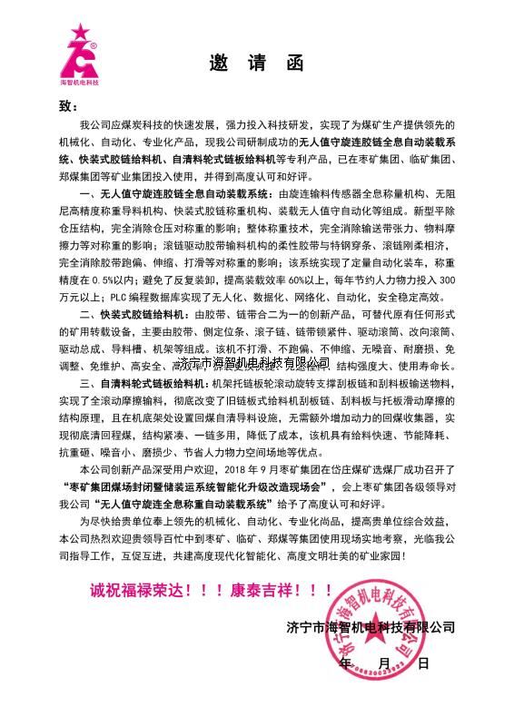 我公司應(yīng)煤炭科技的快速發(fā)展,強(qiáng)力投入科技研發(fā),實(shí)現(xiàn)了為煤礦生產(chǎn)提供領(lǐng)先的機(jī)械化、自動(dòng)化、專業(yè)化產(chǎn)品,現(xiàn)我公司研制成功的無人值守旋連膠鏈全息自動(dòng)裝載系統(tǒng)、快裝式膠鏈給料機(jī)、自清料輪式鏈板給料機(jī)等專利產(chǎn)品,已在棗礦集團(tuán)、臨礦集團(tuán)、鄭煤集團(tuán)等礦業(yè)集團(tuán)投入使用,并得到高度認(rèn)可和好評。